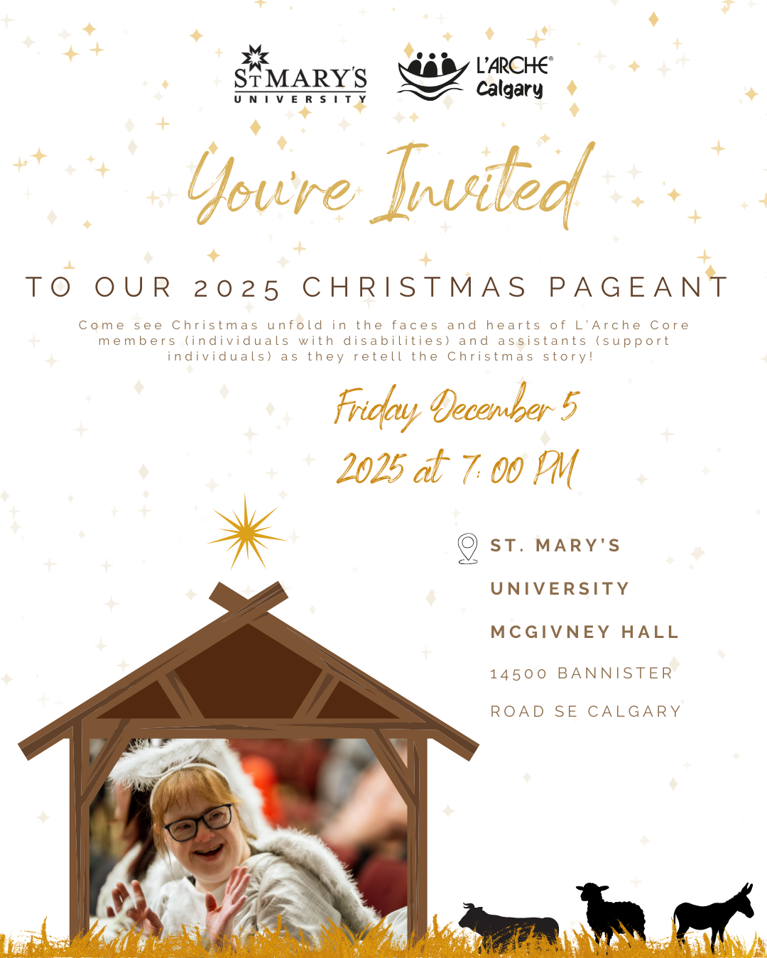 McGivney Hall 14500 Bannister Road, Calgary, Alberta, CanadaCome see Christmas unfold in the faces and hearts of L'Arche Core members (individuals with disabilities) and assistants (support individuals) as they retell the Christmas story!
